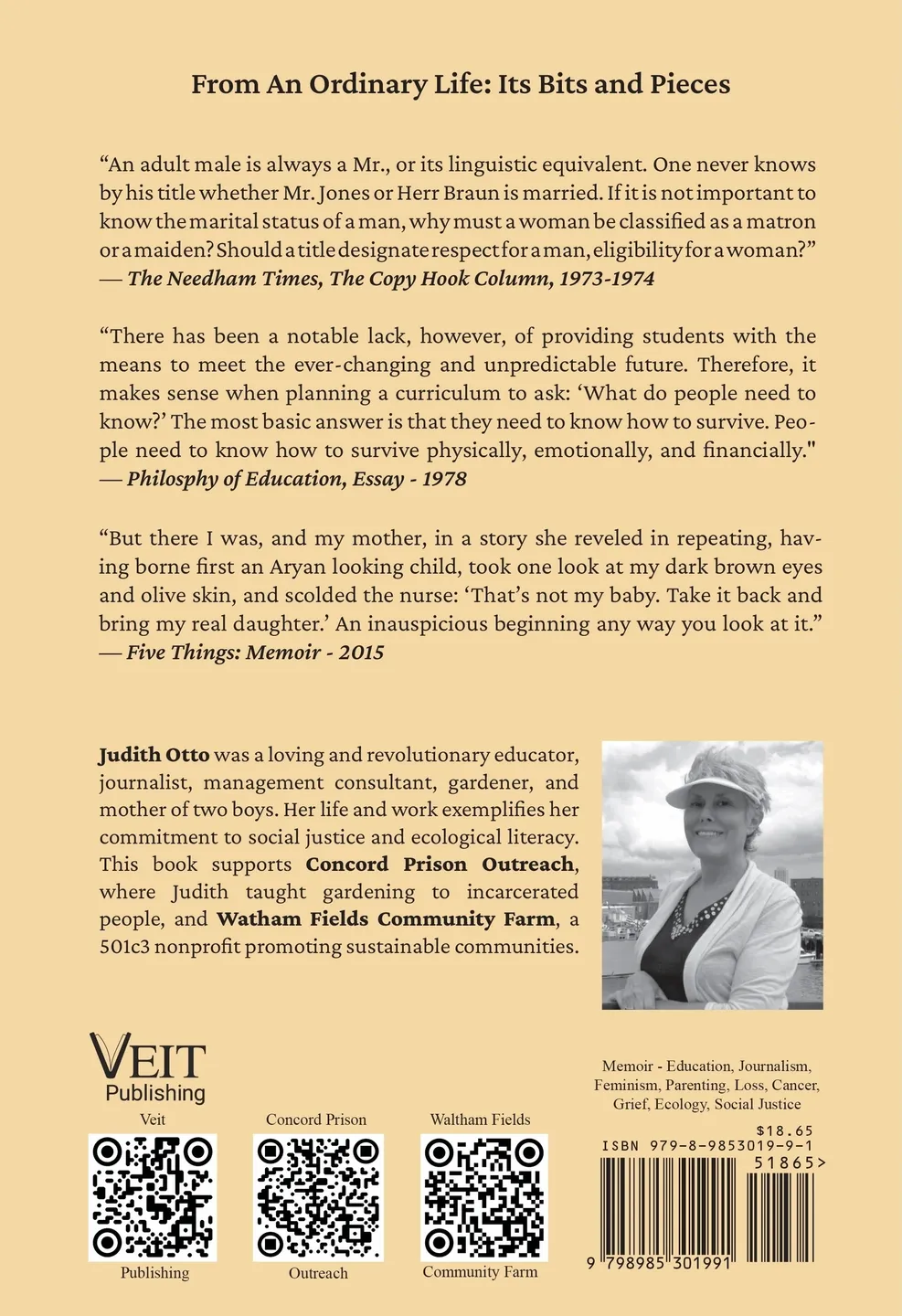 An Ordinary Life: Its Bits and Pieces is a quietly radical collection that redefines what it means to educate and lead. Through memoir, journalism, letters, and essays, Judith Otto offers a clear, compassionate vision rooted in her decades as an educator, mother, social ecologist, and executive coach. Her writings argue that true preparation for life goes far beyond traditional academics. Survival—physical, emotional, and ethical—requires knowing oneself, understanding others, and mastering process skills like decision-making, communication, and reflection.
